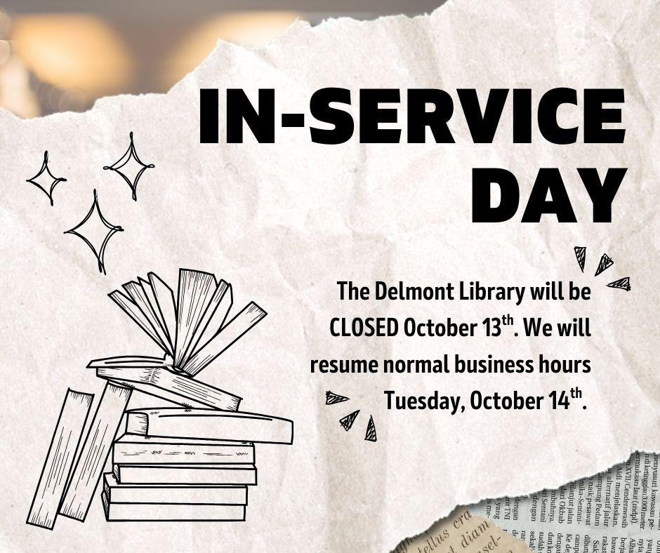 In-Service Day! The Delmont Library will be CLOSED October 13th. We will resume normal business hours Tuesday, October 14th. + Add to Google Calendar + iCal / Outlook export Date Oct 13 2025 Time All Day Share this event