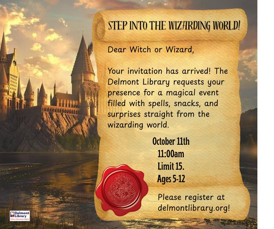 Your invitation has arrived! The Delmont Library requests your presence for a magical event filled with spells, snacks, and surprises straight from the wizarding world.